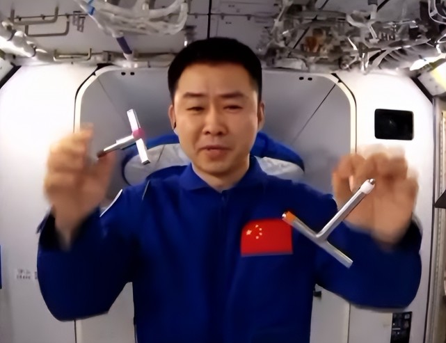 这个实验非常神奇,当陈冬老师让一个扳手旋转起来后,扳手会不停地翻跟头。这是苏联航天员贾尼别科夫在空间站中偶然发现的,所以也叫贾尼别科夫效应,研究发现这个现象与扳手的旋转方式和它质量的分布有关系。这个现象在地面不太容易看到,但是在太空中这就是小菜一碟。