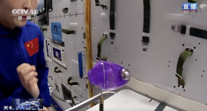 水球“变懒”实验中,一颗钢珠进入水球后,钢珠也不会从水球中掉落,水球在同等风力的吹动下不会破碎,但明显减少晃动“变懒”了。李宏年教授介绍,水对钢球有粘滞力,钢球冲进去后由于重力微弱不会从水球中掉落。水球“变懒”背后的原理是,晃动或振动的幅度与物体的质量成反比,振动的频率也随质量增大而减小(注:太空里没有重量,但质量一点也不少)。