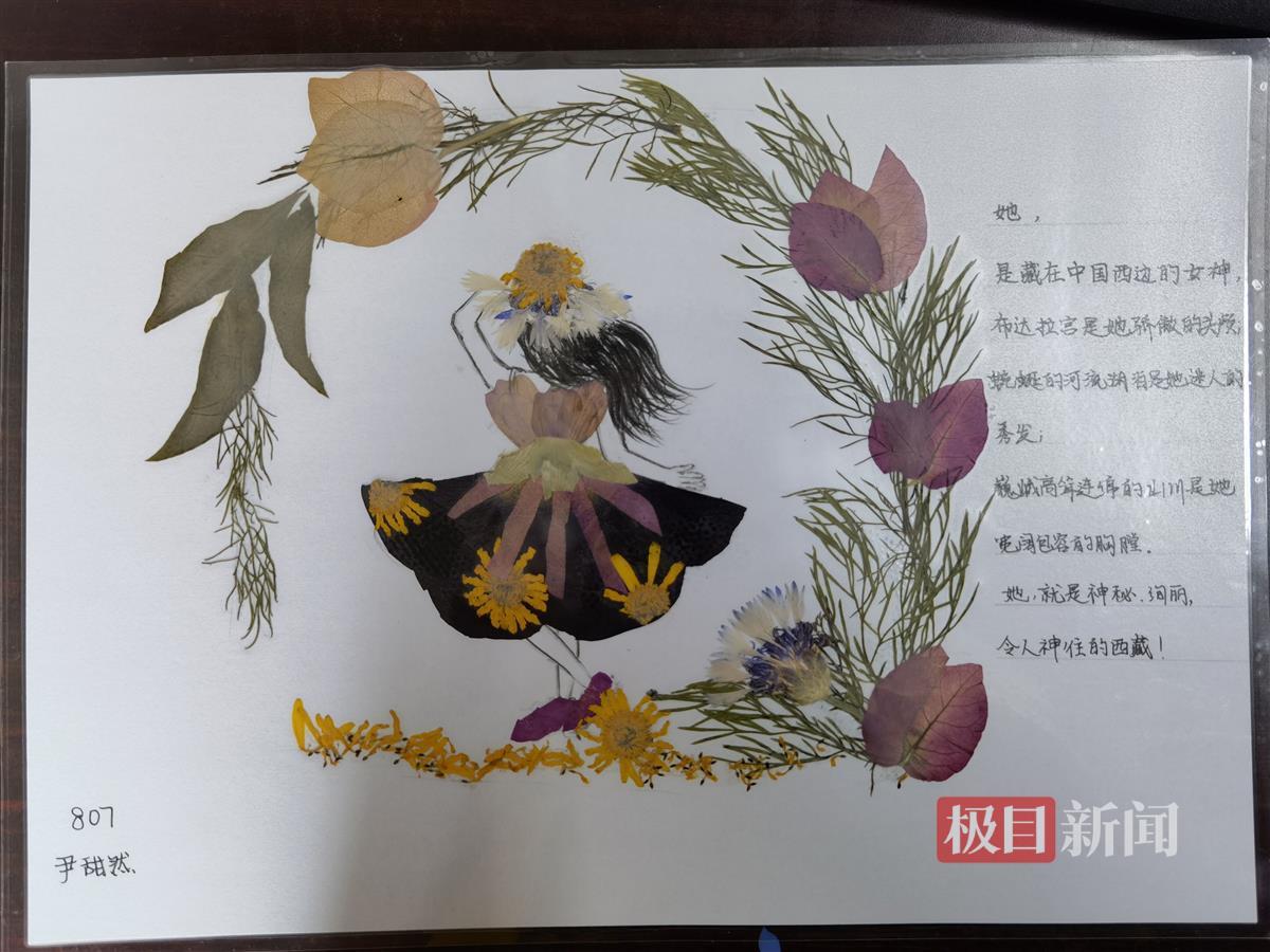 “她是藏在中国西边的女神,布达拉宫是她骄做的头颅;蜿蜒的河流湖泊是她迷人的秀发;巍峨高耸连绵的山川是她宽阔包容的胸膛。她,就是神秘、绚丽、令人神住的西藏!”学生尹甜然同学表示,相比传统的语文作业,这样的作业充满创意又有趣,需要学生运用想象力,她提交的作品是一幅以西藏之旅为主题的作业,“暑期的西藏之旅让我印象深刻,神秘、绚丽、令人神往的西藏就像中国西方的女神。所以我创作了这个插图,插图所用的花草是我在西藏沿途采摘的,有一丈红、叶子花,非洲菊......”尹甜然表示,希望通过作品表达出对神圣之地——西藏的赞颂,更想表达出“最美的风景在路上”。