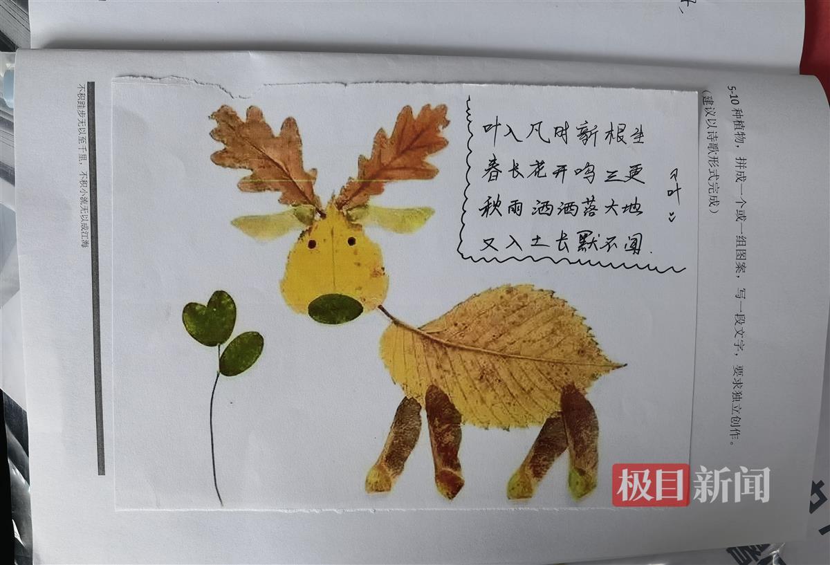 原来,这是武汉市第四十九初级中学七年级语文组布置的一项假期创意作业。“双减”政策下,如何让学生减少机械性抄写的作业,在高效、有趣的活动中学习语文,同时又能提升学生的综合素质,培养多才多艺的能力?该校语文组的老师们布置了“诗情画意,诗歌配画”的特色作业,作业要求学生寻找5~10种植物,拼成一个或一组图案,并配上文字诗歌。