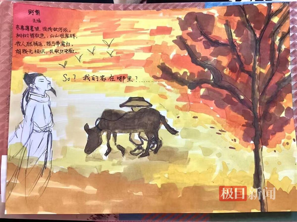 学生胡煜祺通过对树、山、日、牧人、猎马的描绘,将《野望》一诗中诗人所望之景一一勾勒了出来。画中牧人驱犊而返,猎马带禽而归,只有诗人还在独自徘徊、无所可依。“理解古诗,抓意象最重要,所以我从诗人的视角,将诗句中的意象都画了出来,这也加深了我对诗歌意境的理解”。“根据诗的内容来作画还是不难,我已经理解了诗的意思,但要突出诗人的孤寂落寞,我还需要在诗人的形象上认真推敲。所以,我特意给诗人画了一个表情特写。”学生李榆生说,他从小喜欢唐诗,目前已经背了不少唐诗,对于这种学习唐诗的方法,他表示兴致很高,受益很大。