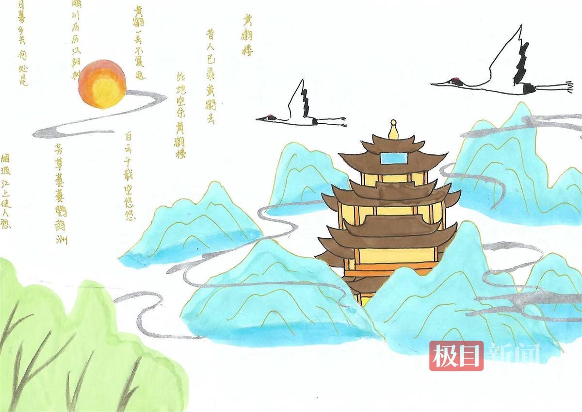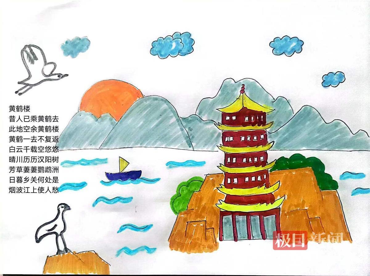 “晴川历历汉阳树,芳草萋萋鹦鹉洲……”一首《黄鹤楼》,该班学生抓住诗歌里的重要意象“昔人乘鹤”“白云飘悠”“树荣草茂”“烟波袅袅”等画出了诗人登楼远眺、吊古伤今“意境”,十分生动。