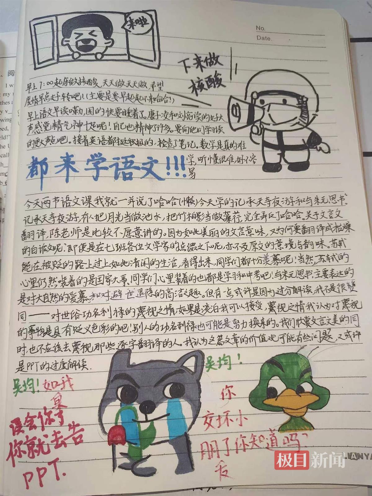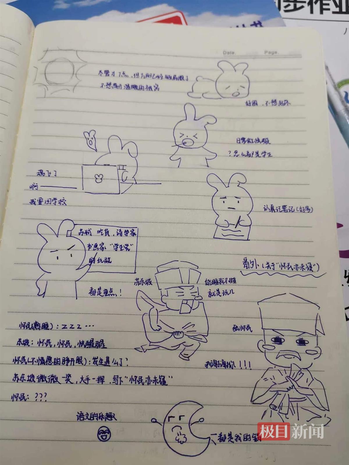 该班方迪鸥用漫画兔记录了一天的生活,“尽管7点,但太阳已经晒屁股了,不想离开温暖的被窝”,旁边是一只好困不想起床的兔子,随即是日常做核酸的兔子、认真记笔记的兔子,最令人捧腹的是,当天他学习了课本《记承天寺夜游》,课堂要求学生们总结其中的情感,方迪鸥还随手创作了一幅“怀民亦未寝”的漫画,模拟苏东坡和张怀民人物对话,人物创作也惟妙惟肖。