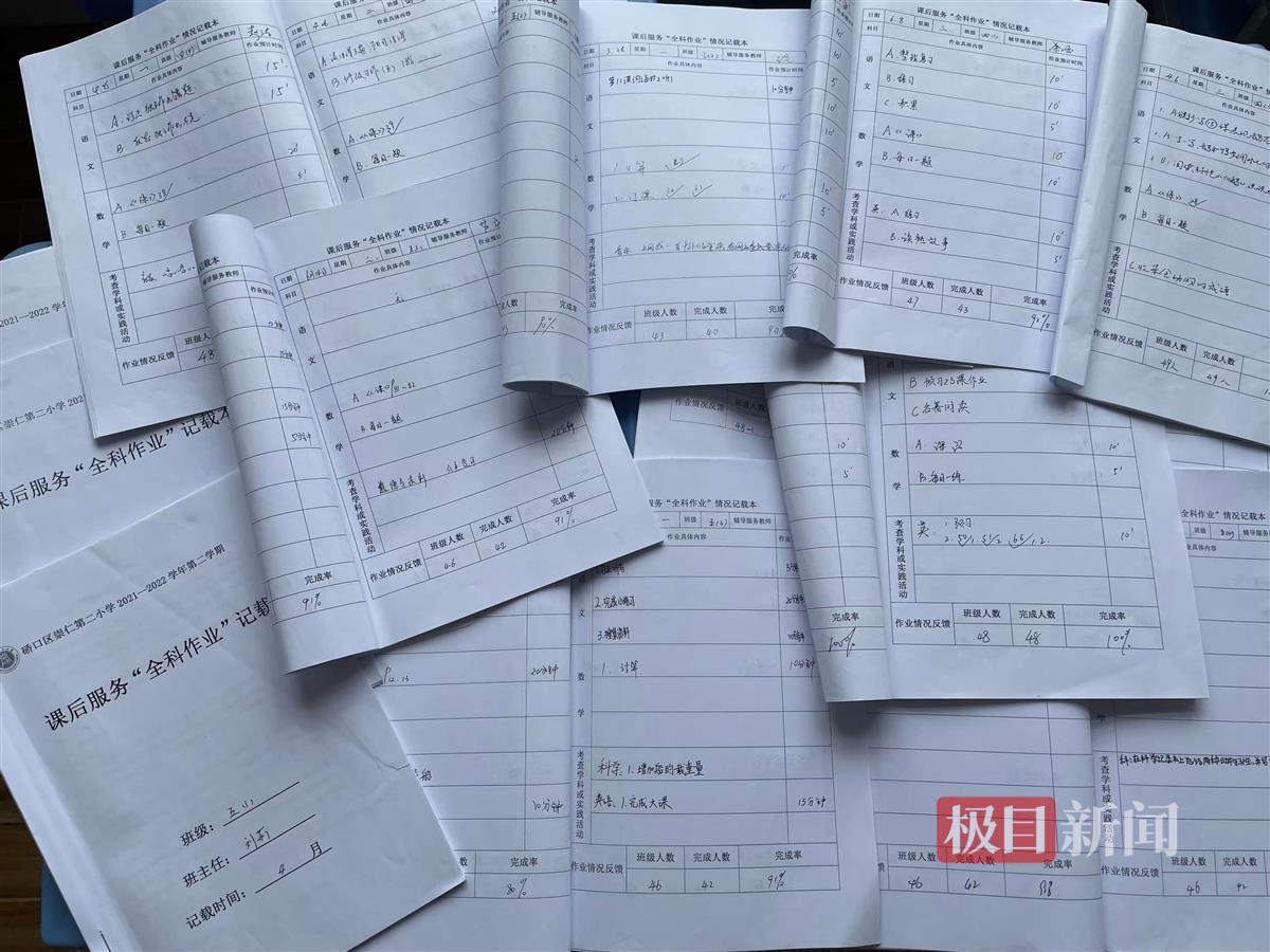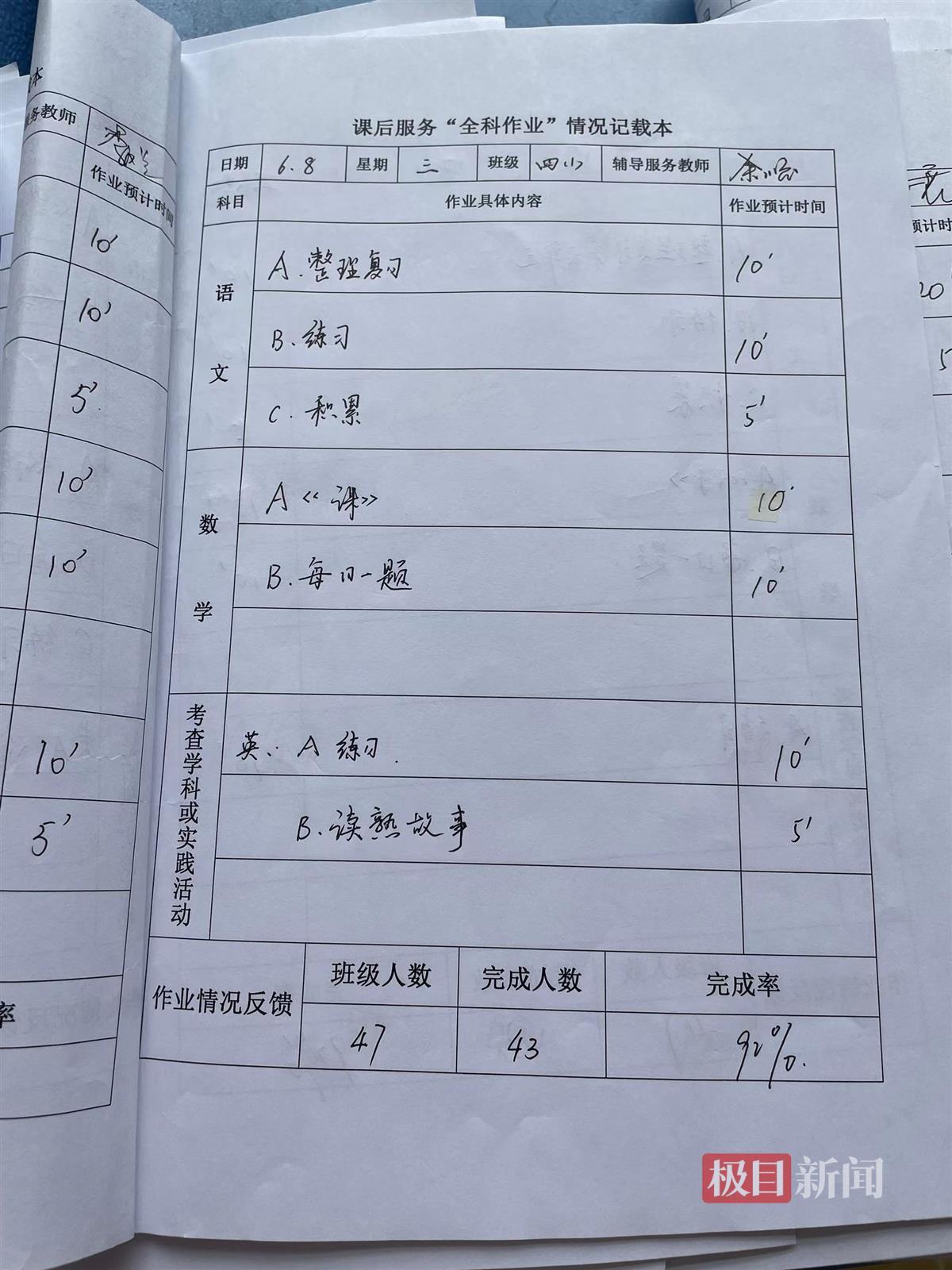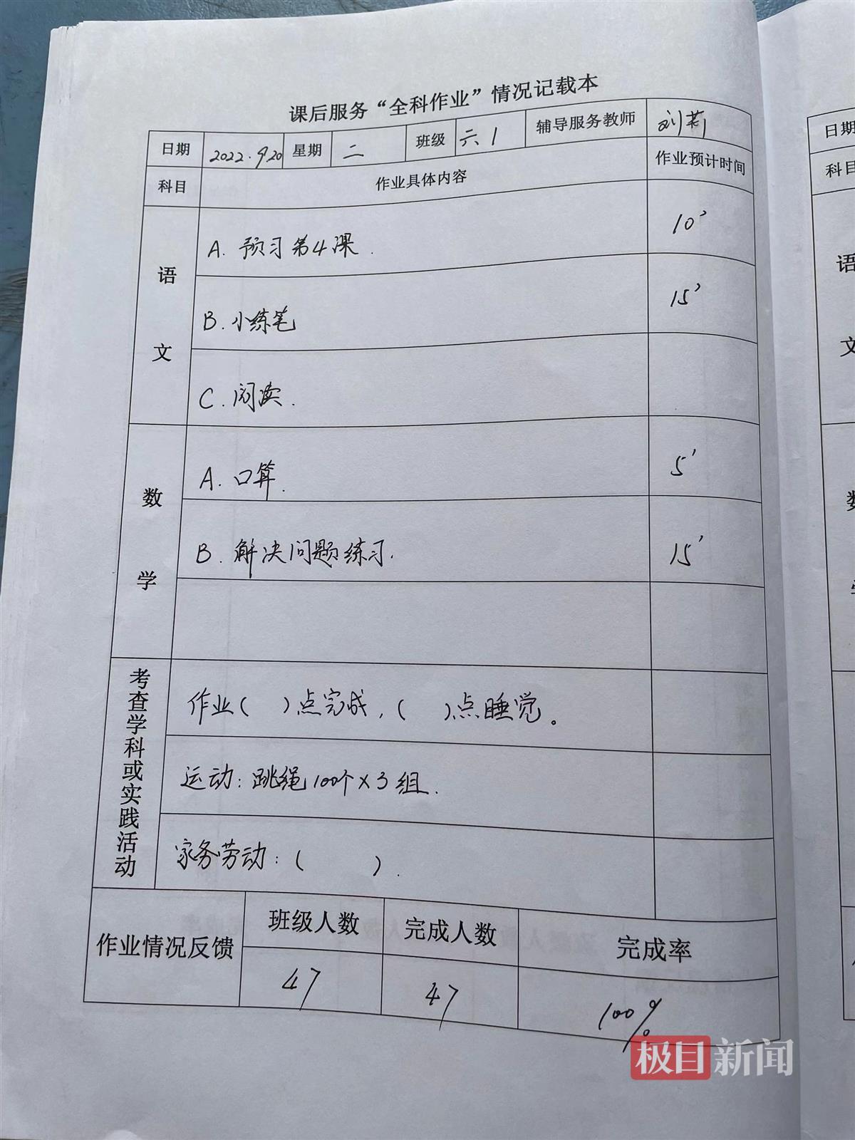 “9月20日,语文作业A:预习第4课,预计10分钟完成;作业B小练笔,预计15分钟;数学作业A:口算,预计5分钟;作业B:解决问题,预计15分钟完成。实践作业:跳绳300个……”刘莉老师向极目新闻记者展示的班级“全科作业本”上,详细记载着每天各类型作业的具体内容和预计时长,每页的最后是班级作业完成情况的反馈。