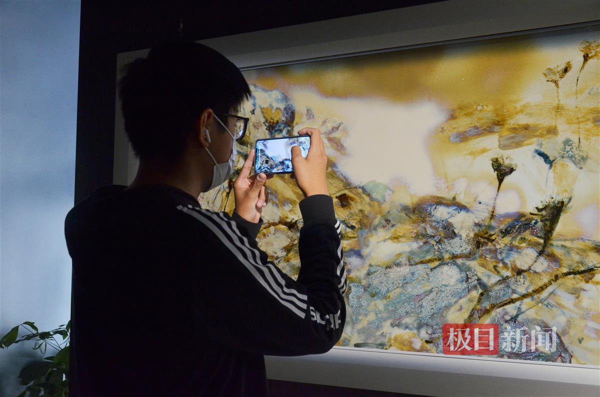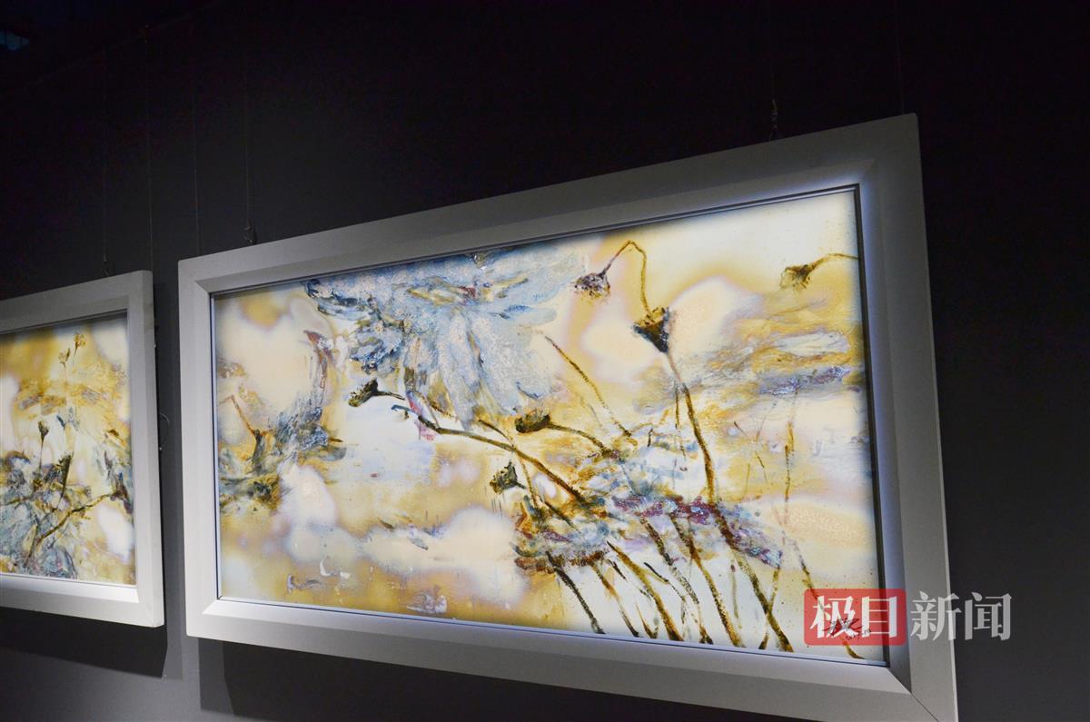 画作中黄白的地块相互交错着,或直或弯的黑褐色荷花屹立其中。几抹艳红色点缀画作,使早已衰败的荷花再次出现欣欣向荣的景象。这系列作品将高温颜色釉与中国画相结合,作品整体呈现素雅淡泊之风。各类颜色因高温烧制而相互交杂,却并不显凌乱,别有一番和谐美。“这幅作品属于‘荷合系列’,这一系列作品均为艺术学院院长管家庆所作,一直被大家默认为‘镇馆之宝’。”管家庆的学生朱君介绍道。