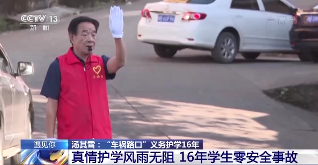 16年,寒来暑往,只要是学生上学的日子,汤老师每天都会守在路口护学。即便学生放寒暑假,他也会站在路口为其他社会车辆疏导交通,每年上岗时间将近340天,每天平均四个小时。16年里,他护学的路段没有发生过一起学生安全事故。