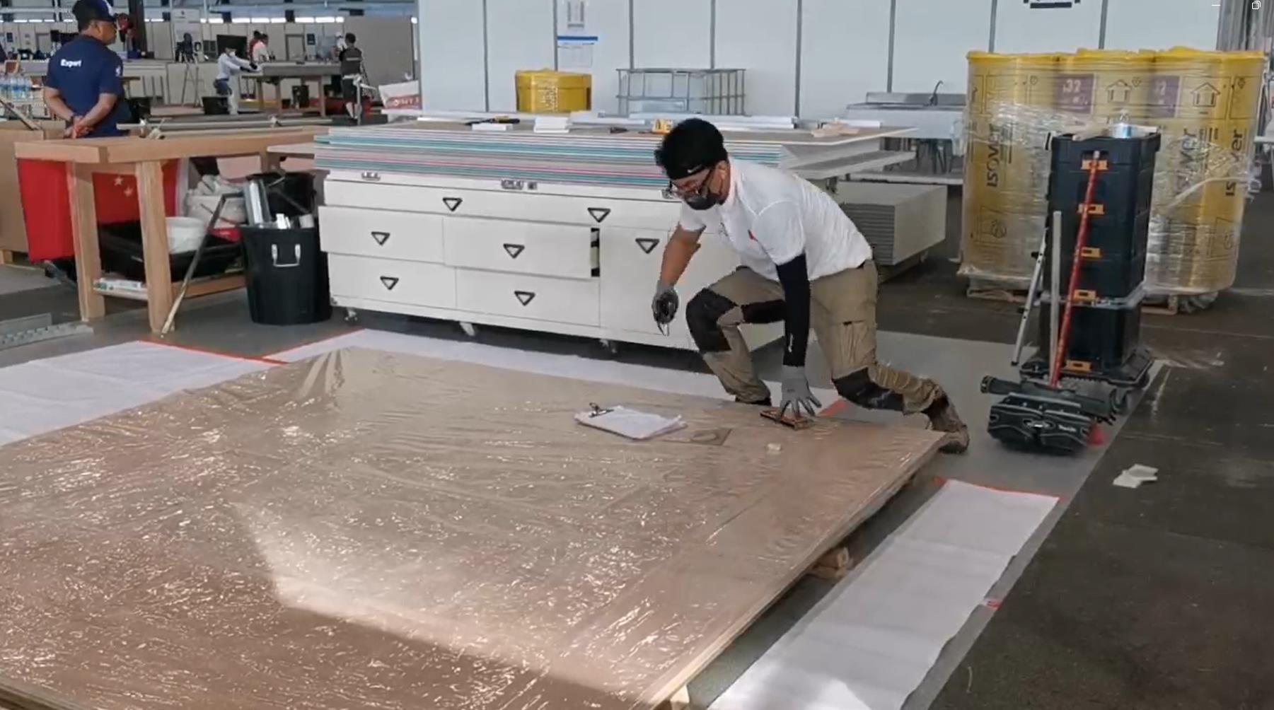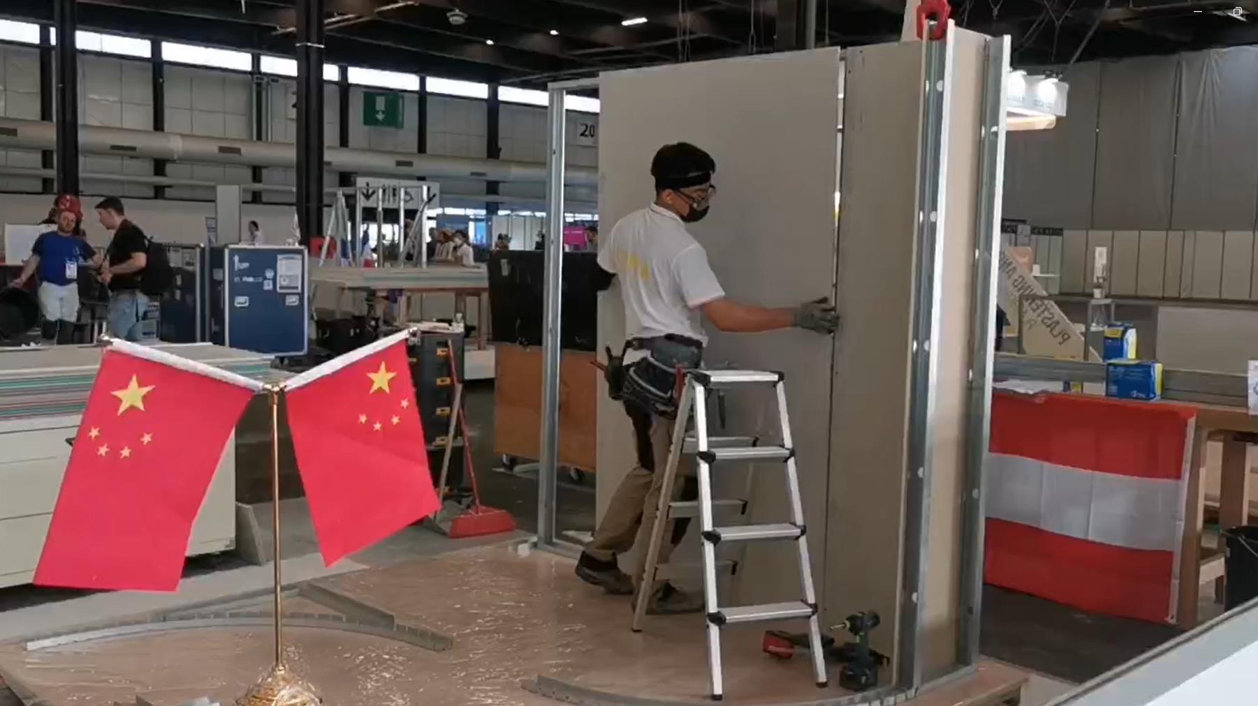 马宏达:这次共有14个国家和地区的选手参加比赛,比赛项目主要是“抹灰与隔墙系统”,比赛内容有五个模块。第一个模块,就是利用石膏板和轻钢龙骨搭建一个隔墙系统;第二模块是增加隔墙系统的功能性;第三模块是按照不同要求和标准在不同墙面上抹灰;第四模块是石膏线竞速,比拼速度和精度;第五模块是自由创作,比如一块空白的墙,选手要根据自己的设计,不仅要把技艺和创意都发挥起来,还要达到美观效果。