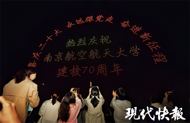 随后,“热烈庆祝南京航空航天大学建校70周年”文字展现,无人机为南航送上祝福。