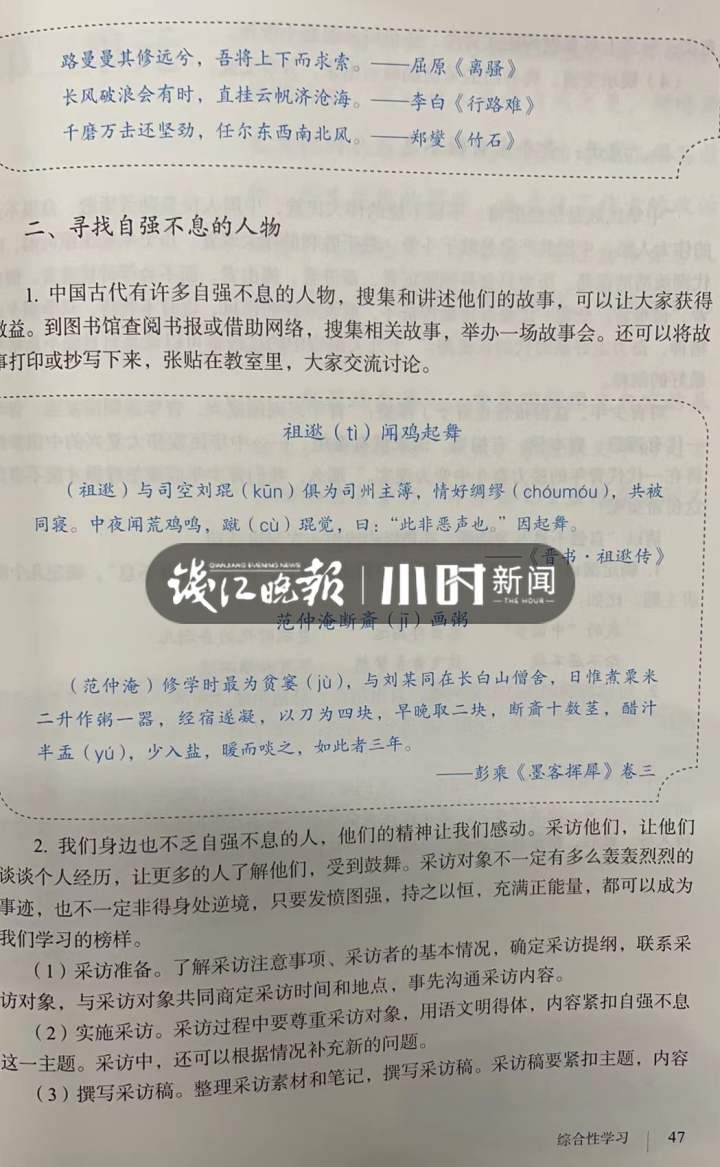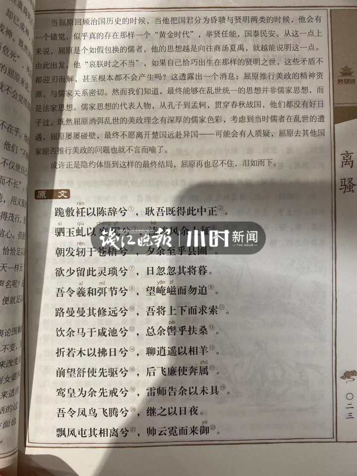 钱江晚报·小时新闻记者在采访中发现,“路曼曼其修远兮”这句诗,出现在人教版语文教科书九年级上册的综合性学习内容中。该综合性学习内容的主题为“君子自强不息”。文中表示,中国古典诗词中不乏体现自强不息精神和风骨的作品。课本里列举了三句诗词名句,让同学们感受古人自强不息的精神,理解自强不息的含义。其中之一就是“路曼曼其修远兮,吾将上下而求索”。
