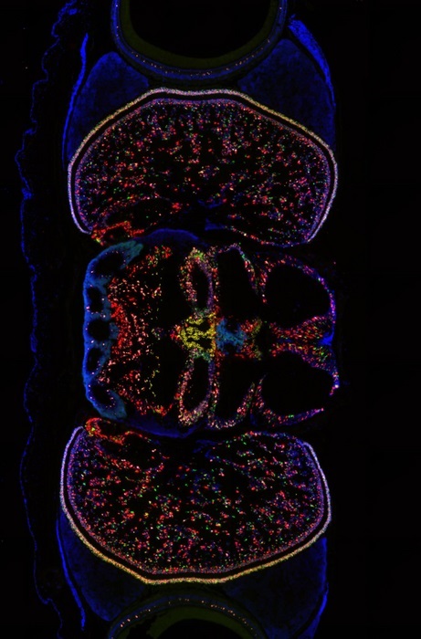 章鱼大脑的荧光图像显示不同类型神经元的位置。图片来源:尼尔实验室
