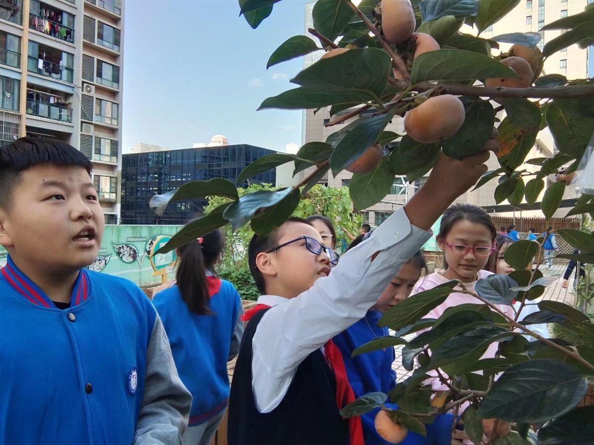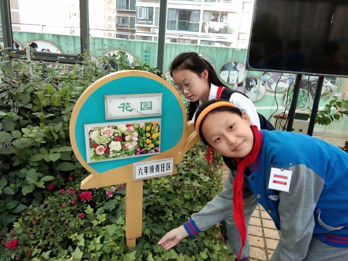 一片片的白菜,黄澄澄的柑橘、红彤彤的杮子,三五只小兔在“牧乐场”里悠闲地吃着菜叶,一群鸟儿棸集在“悦鸟林”里放声歌唱……开在教学楼屋顶的“行知农场”,则是三至六年级学生的劳动实践基地。原本空旷的屋顶被分隔出花园、果园、菜园、茶园、牧乐场和悦鸟林,世外桃源一般。每个班级认领一块区域,成立“护绿小队”,在科学老师和花匠的指导下,参与到日常种植蔬菜、采摘水果、培育花卉、饲养小动物中。