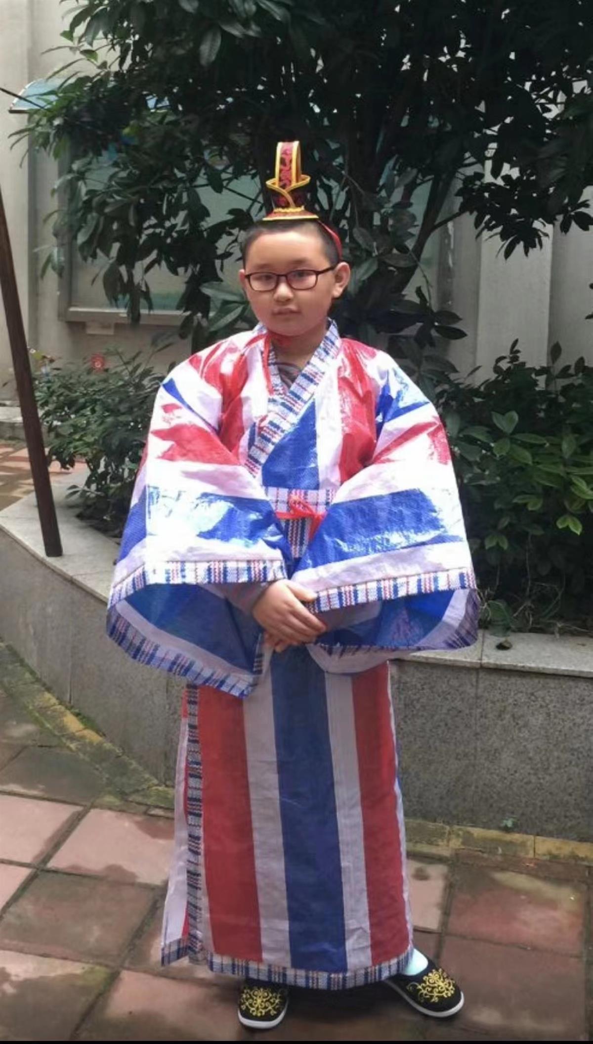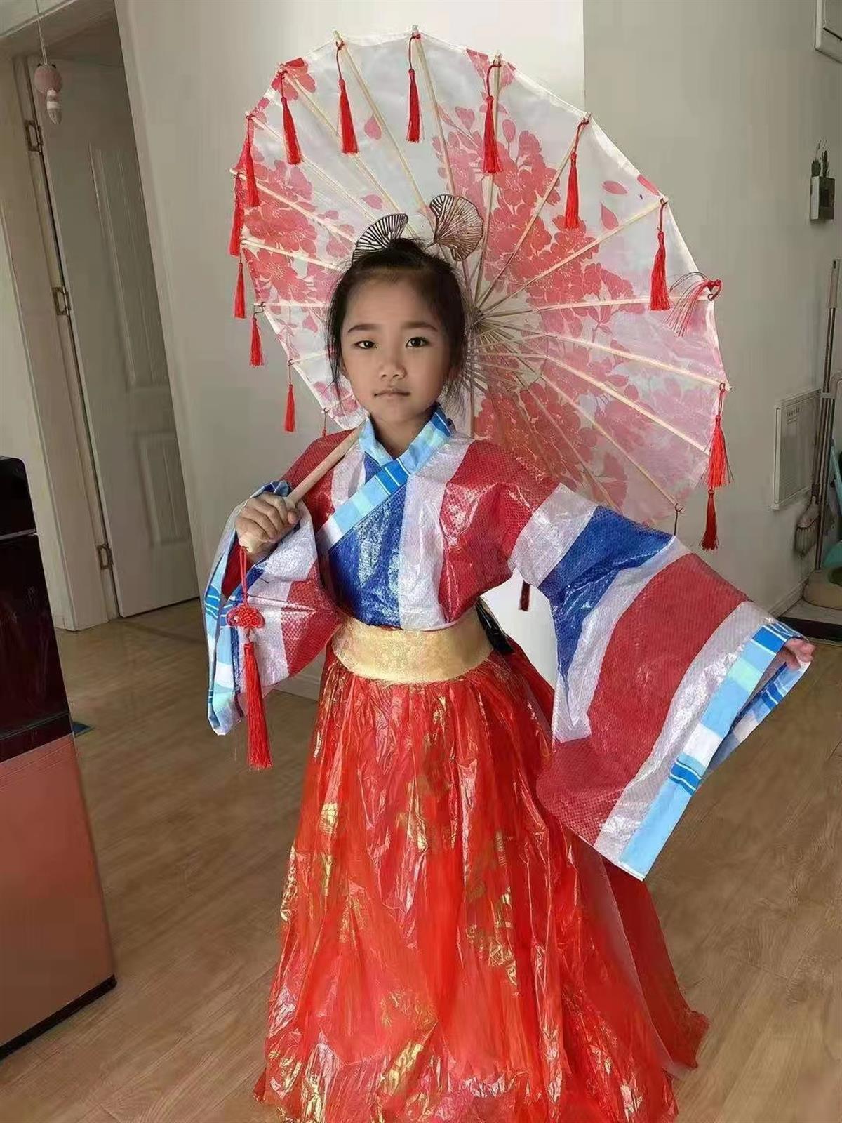 四年级班主任胡亚刚老师介绍,一次班上借“变废为宝”的活动契机组织“汉族服装大走台”,同学们脑洞大开,利用编织袋、食品包装、塑料瓶等废旧物品制作衣物,进行了一场华丽的服装走秀。