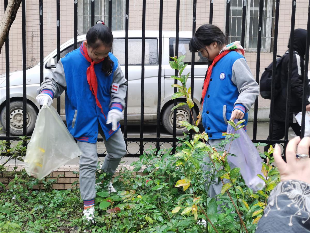 学生在花坛松土、捡垃圾守护“责任田”