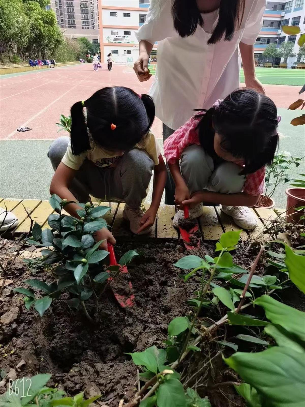 每当课后服务时段,行知小学的校园里便热闹起来。一、二年级开展种植实践活动,学校开辟出专属区域种植花草,让班级、学生前来认领,老师们将科学知识和生命教育渗透于这方寸间的花坛里。