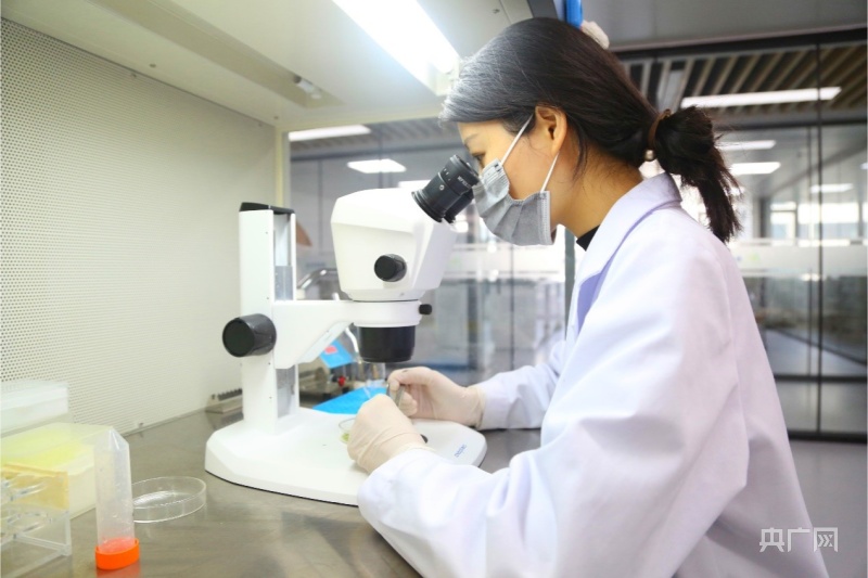 工作人员在显微镜下取种子的幼胚(央广网记者唐磊摄)