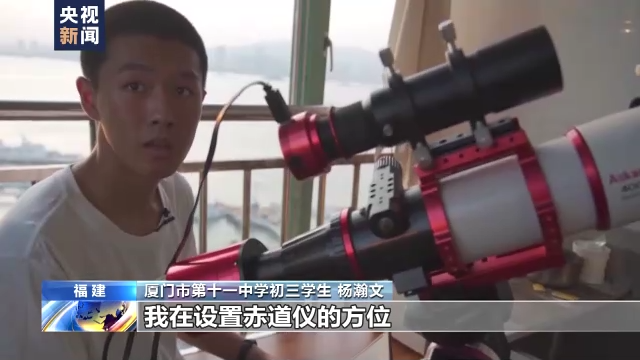 厦门市第十一中学初三学生 杨瀚文:我在设置赤道仪的方位,就是它所在的坐标跟位置。现在望远镜正在拍太阳,可以看到上面有一些太阳黑子,这些就是太阳黑子。其实我觉得我也没有什么突出的地方,总体来说还是一个中国普通初中生。像我擅长天文,但足球我就不行,每一个人都有擅长的地方。我们都是平凡的人,但是我们都有不平凡的梦想。