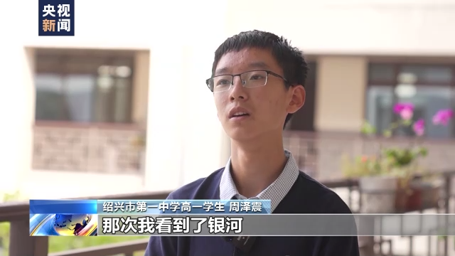 绍兴市第一中学高一学生 周泽震:那次因为是夏季,我看到了银河,就是白白的一条带,就是横在天空上。我当时都不知道那是什么东西,我以为是一块云,查了之后才知道那是银河,我觉得这东西好奇妙,就喜欢上了。
