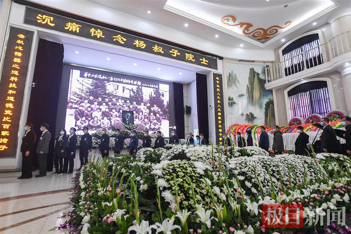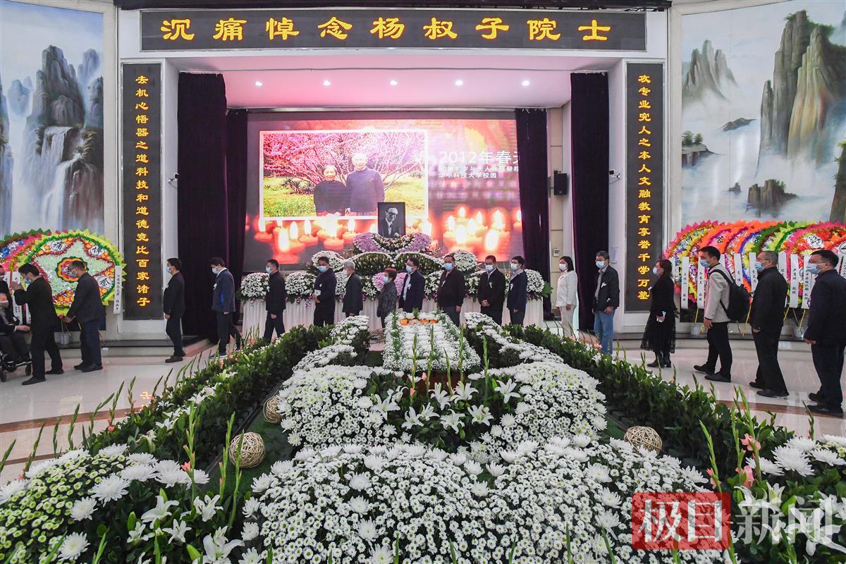 11月8日上午,纪念堂内,杨叔子院士的遗像摆在正堂,由李培根院士题写的挽联“攻专业究人之本人文融教育享誉千学万塾 去机心悟器之道科技和道德竞比百家诸子”伫立两旁。数百名社会各界人士敬赠的花圈摆放灵堂两侧,以寄哀思。