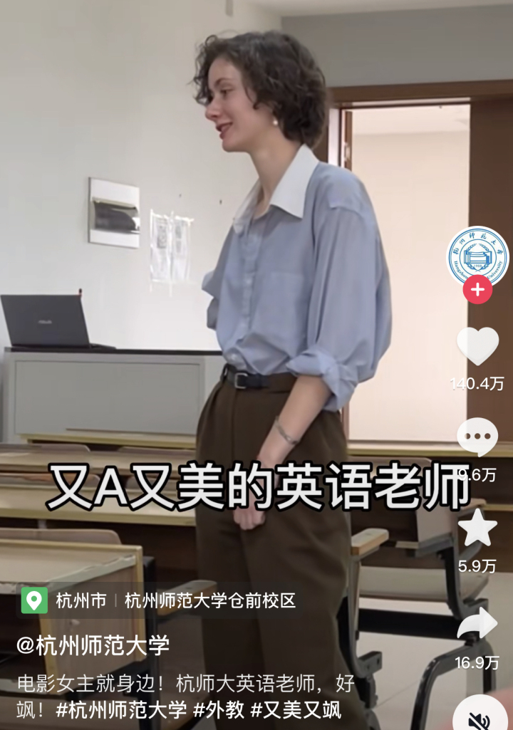 在杭州师范大学的官方账号中,关于梅根的这条“又A(帅气)又美的英语老师,无暇不出,只是挂出来炫耀一下”的视频,收获了140万赞,近10万条评论。网友称赞道,“这要是我的老师,四六级裸考都能过!”“这么飒的老师应该不会有人逃课吧?”“遇到氛围感美女老师,我想重回大学读英语。”