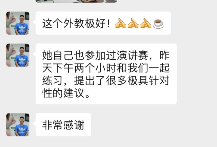 任课一个月的时间里,梅根的专业能力有目共睹,演讲队的其他老师也为她连连称赞。在杭州师范大学国际处处长汪学磊给记者展示的屏幕截图里,一位演讲队的老师评价称,“这位外教极好!昨天下午2个小时和我们一起练习,提出了很多极具针对性的建议。”