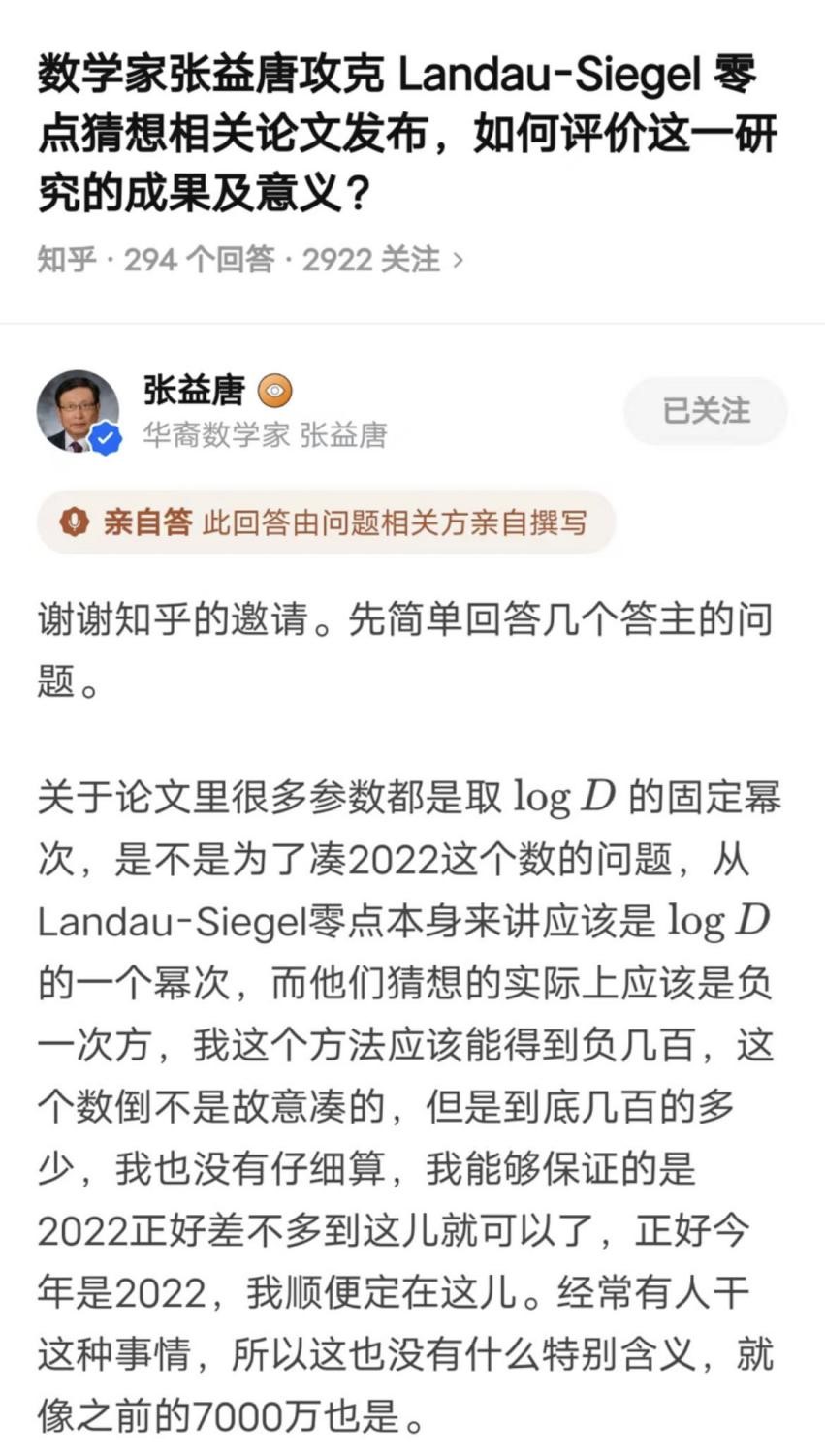 此前,张益唐提交的《离散均值估计和朗道-西格尔零点》论文在预印本网站arXiv上正式对外公开,被认为是近50年来数学界最惊人的成就。张益唐本人也因证明孪生素数猜想和朗道-西格尔零点猜想被称为“被闪电击中两次的人”。