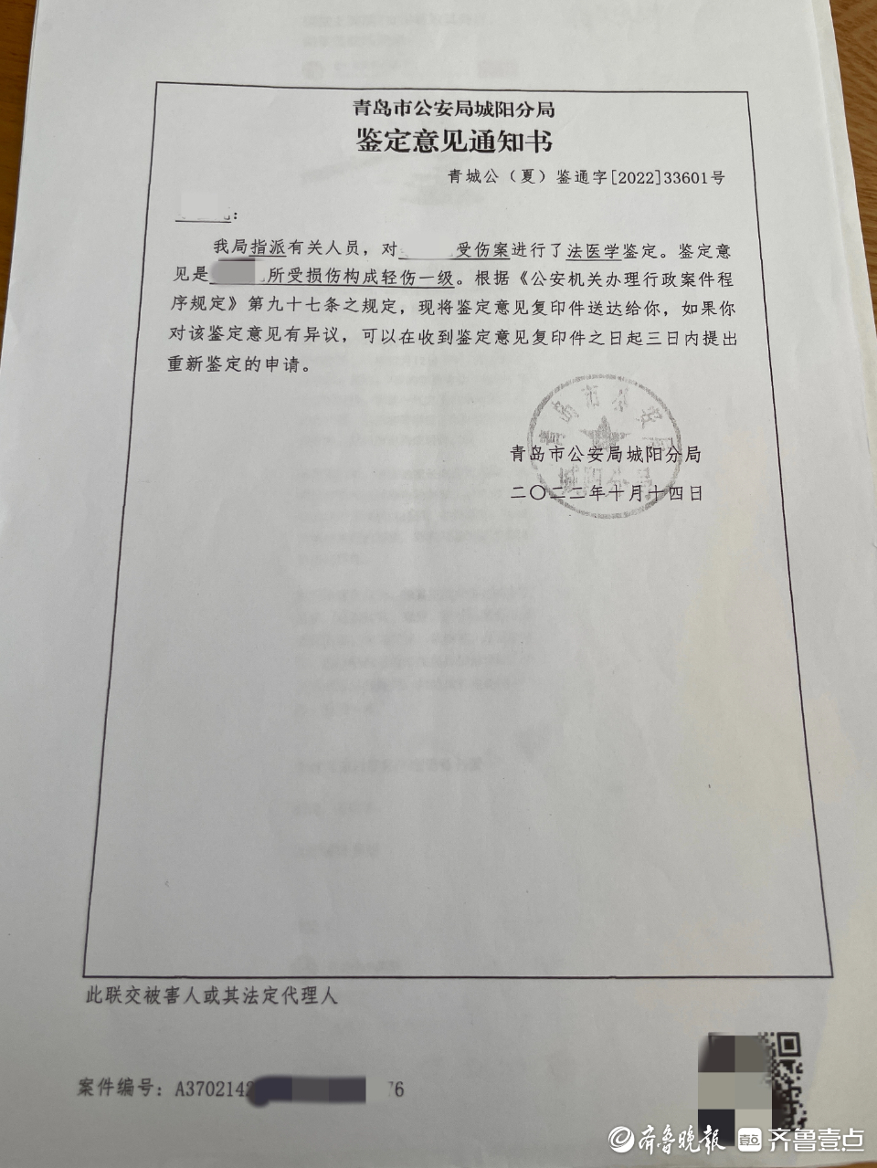 因为王女士需要陪着儿子住院治疗,9月16日王女士的丈夫报警,由城阳夏庄派出所调取事发当时的监控录像。“在监控中能明显看到徐教练有踢踹孩子的动作。”等到孩子伤情稍微稳定了些,9月23日王女士前往夏庄派出所报案,9月26日公安指派有关人员对凡凡进行了伤情鉴定。根据青岛市公安局城阳分局10月14日出具的鉴定意见通知书,凡凡所受损伤构成轻伤一级。