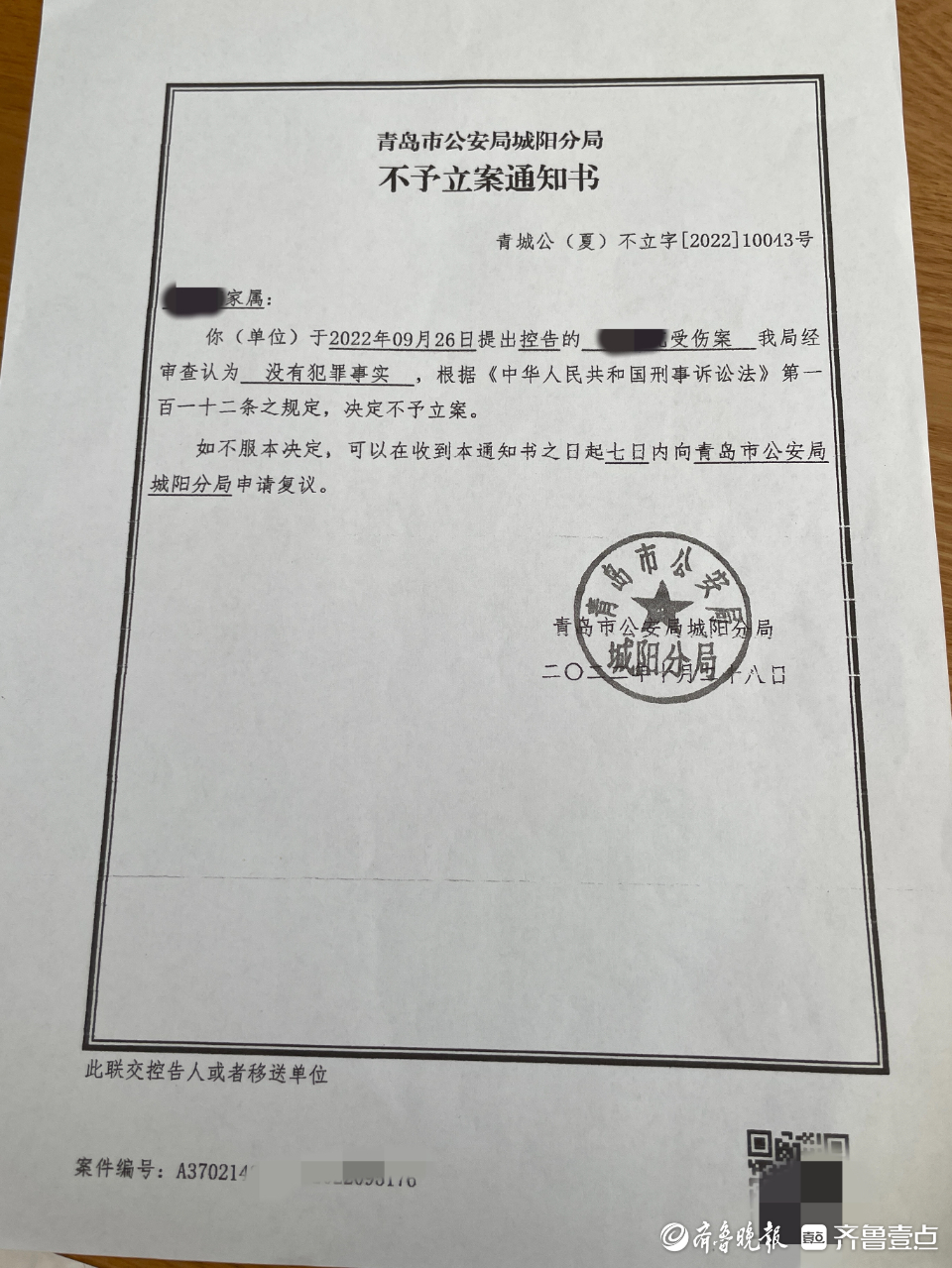 王女士还告诉记者,自己10月21日下午打电话和警方沟通,夏庄派出所警方在电话中口头告知已立案,并将对施暴人进行抓捕。但到10月24日下午再次与警方沟通案件进展时,却被口头告知因案件复杂不予立案,10月28日收到青岛市公安局城阳分局不予立案通知书,通知书上写着“经审查认为没有犯罪事实”决定不予立案。