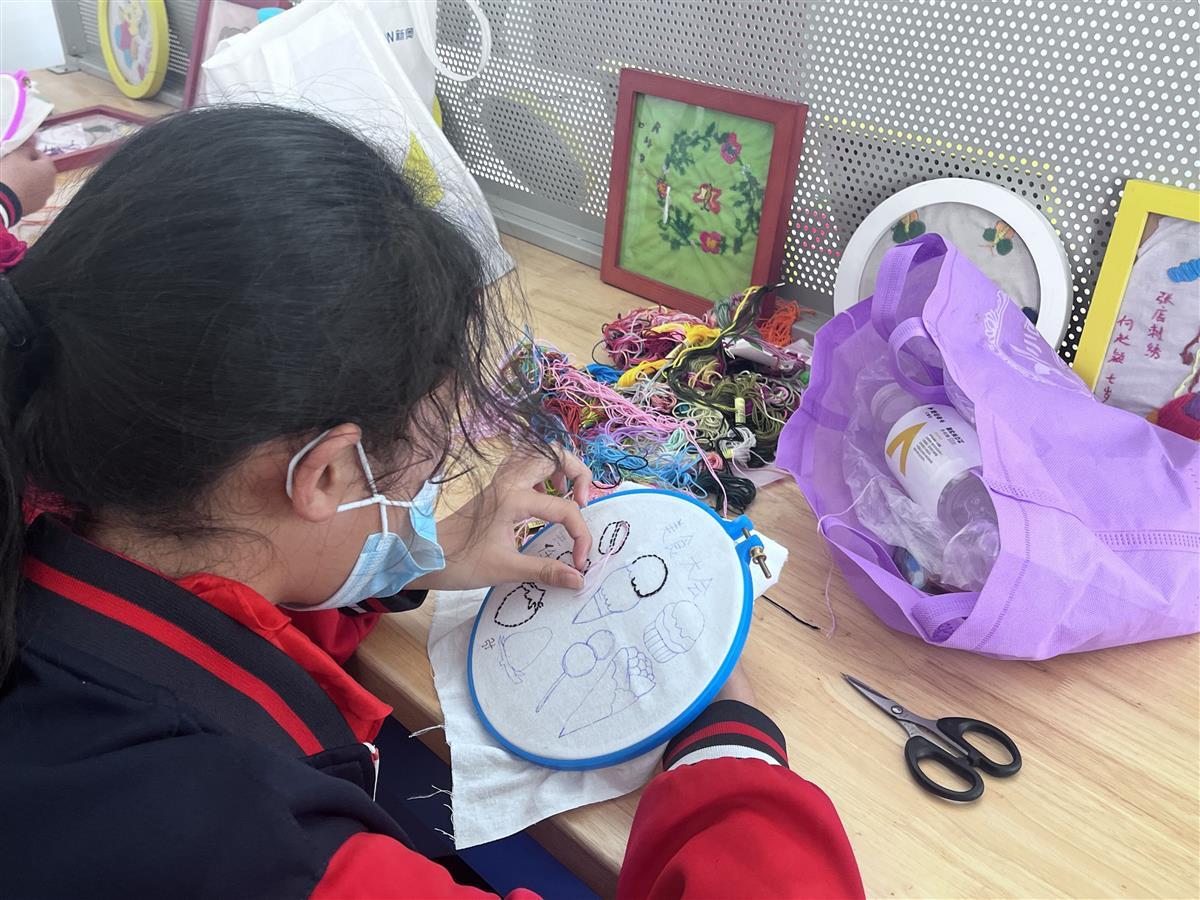 一根根绣花针,穿针、打结,在画框中来回穿梭……孩子们在老师指导下,拿着绣花针,有模有样地绣着自己的作品,还开心地和同伴分享发现的小窍门。