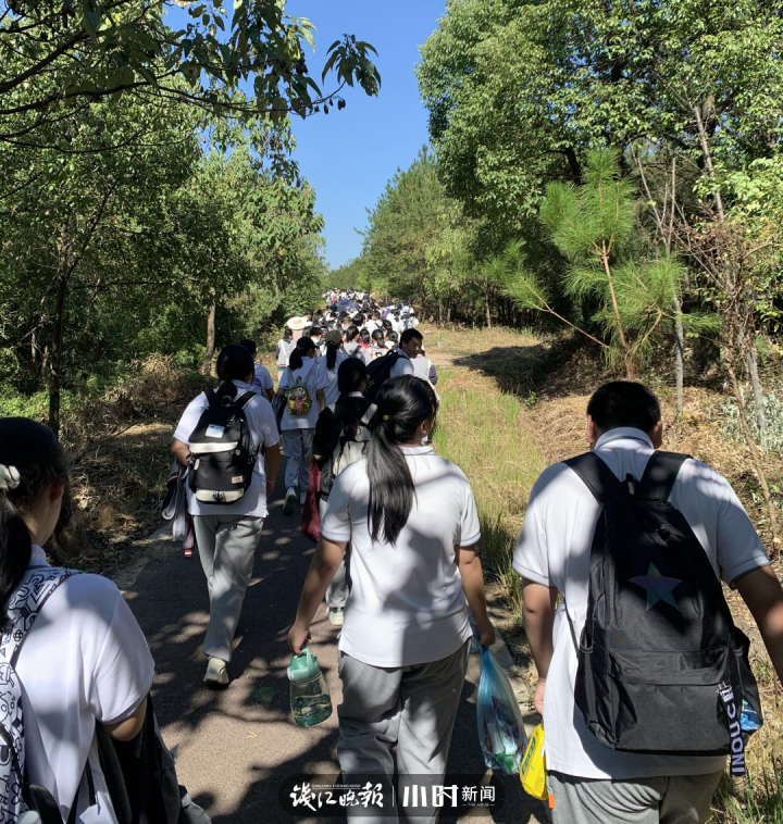 “考虑到900多个学生的安全,我们选择的这条道路,安全性比较高,唯一要过马路的路口,提前安排了三四位交警和四位保安维持秩序,等学生安全通过后,再让车辆通行。”刘校长说,几位年纪较大的老师,组成了服务队,一路上开车为大家“保驾护航”,“有人中暑或者出现突发情况,可以坐上老师的车。”