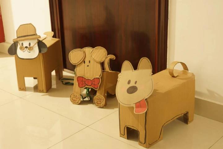 除了纸盒狗之外,老虎、小猫、鳄鱼、恐龙、喜羊羊、灰太狼等等,都在大学生们的巧手和奇思妙想下诞生。