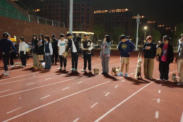 于是,晚间的学校操场上,就出现了这样的一幕:学生在前面聊天散步,后面跟着一条纸盒狗,回头率十足。同学们遛狗,都会自觉地牵绳,讲究一点的,还会给狗戴口罩,大家相互“攀比”谁的狗子更厉害。回寝室后,用绳子“拴”在宿舍门口。