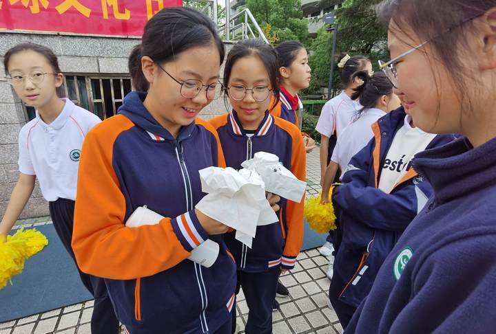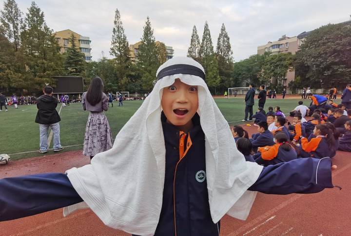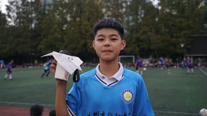 头顶一块布,创意我来秀,同学们脑洞大开,自发玩起了模仿秀,也用同学用餐巾纸和纸杯来制作。快来看看最佳氛围组同学们的创意吧!就地取材的模仿秀作品既营造了浓浓的校园足球氛围,又让同学们感受了足球文化的无限魅力。