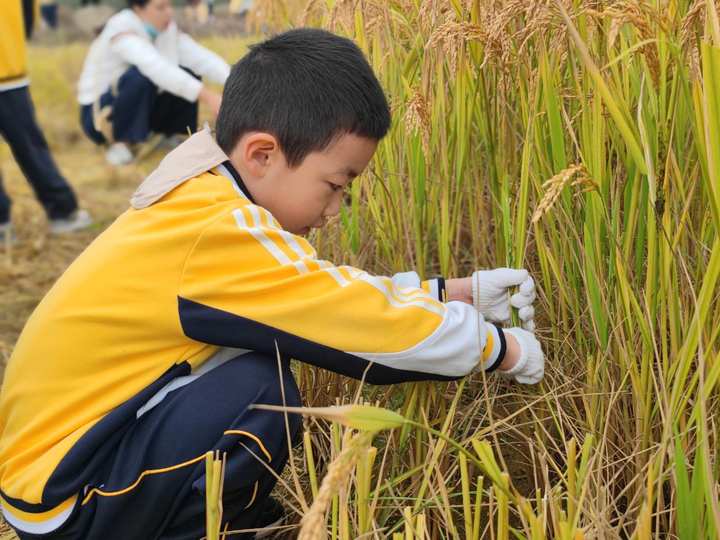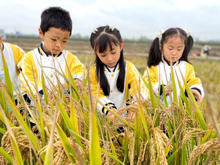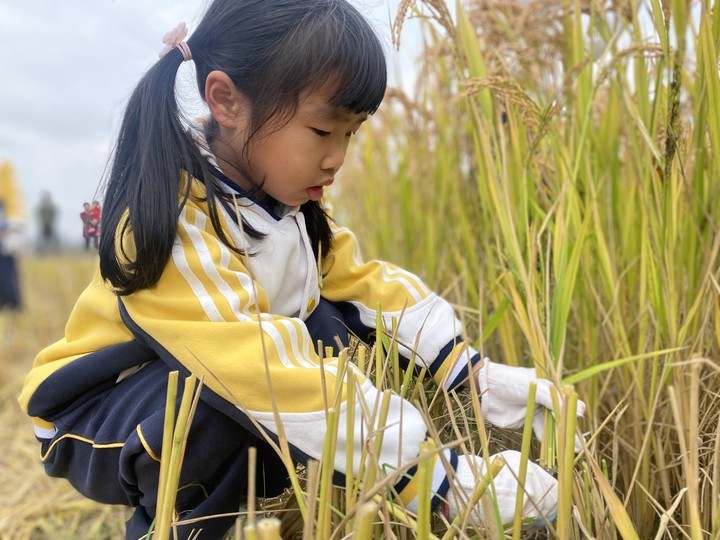 孩子们置身于稻田中,老师和小朋友们讲述水稻到一碗米饭的过程,并示范收割水稻的方法和技巧。随后,孩子们在老师的协助下投身劳动实践,孩子们带上小手套,化身小农夫挥动镰刀,割稻,有的用小剪刀把稻穗剪下来。