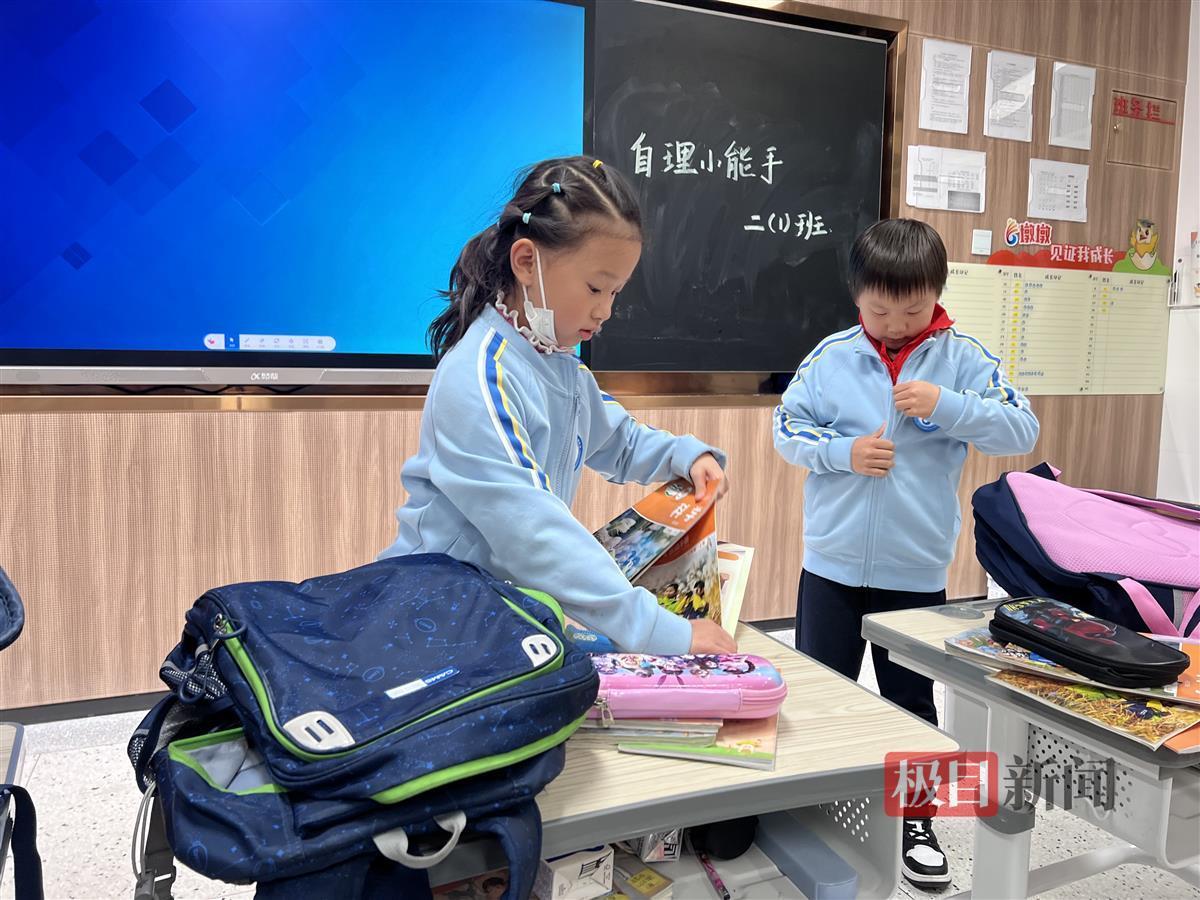 “我妈妈平时上班比较忙,每天都是我自己起床、整理书包、穿衣服、叠衣服,我肯定会很快”,二年级(1)班的学生管菲儿自信地说。他在整理书包和穿衣服环节非常从容自信,不到两分钟,就把书包里的课文按照从大到小整齐排好,不仅穿好了衣服,连红领巾也系得有模有样。