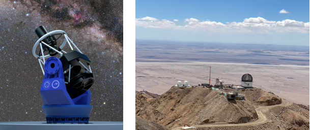左图为大视场巡天望远镜效果图;右图为正在建设中的青海省海西州冷湖镇赛什腾山天文台址和大视场巡天望远镜圆顶。中国科大供图