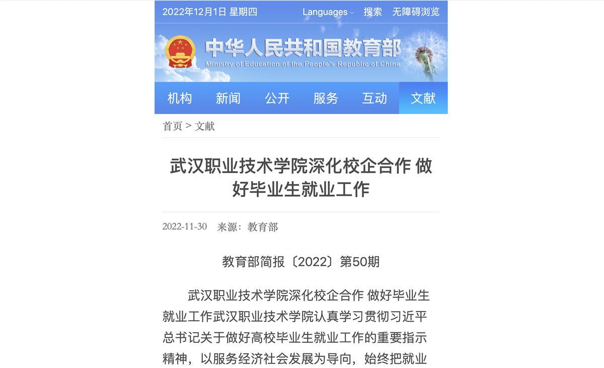 11月30日,教育部简报〔2022〕第50期以“武汉职业技术学院深化校企合作做好毕业生就业工作”为题,介绍了武职认真学习贯彻关于做好高校毕业生就业工作的精神,以服务经济社会发展为导向,始终把就业工作摆在突出位置,持续推进产教融合、深化校企合作,着力建好合作平台,汇聚促就业工作合力,努力推动毕业生更加充分更高质量就业的典型经验和做法。