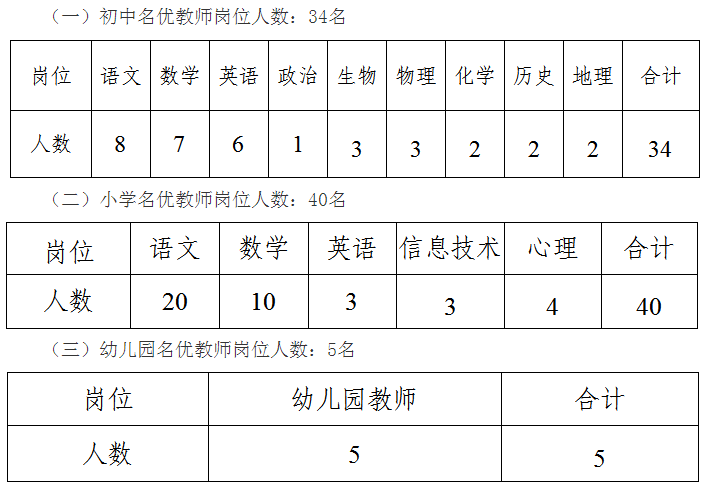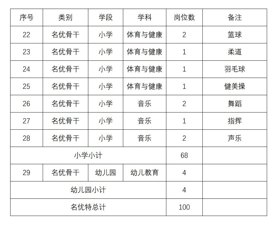 面向社会公开招聘特殊人才和名优骨干教师100名,其中特殊人才5名,名优骨干教师95名(含幼儿园教师4名、小学教师68名、初中教师23名)。