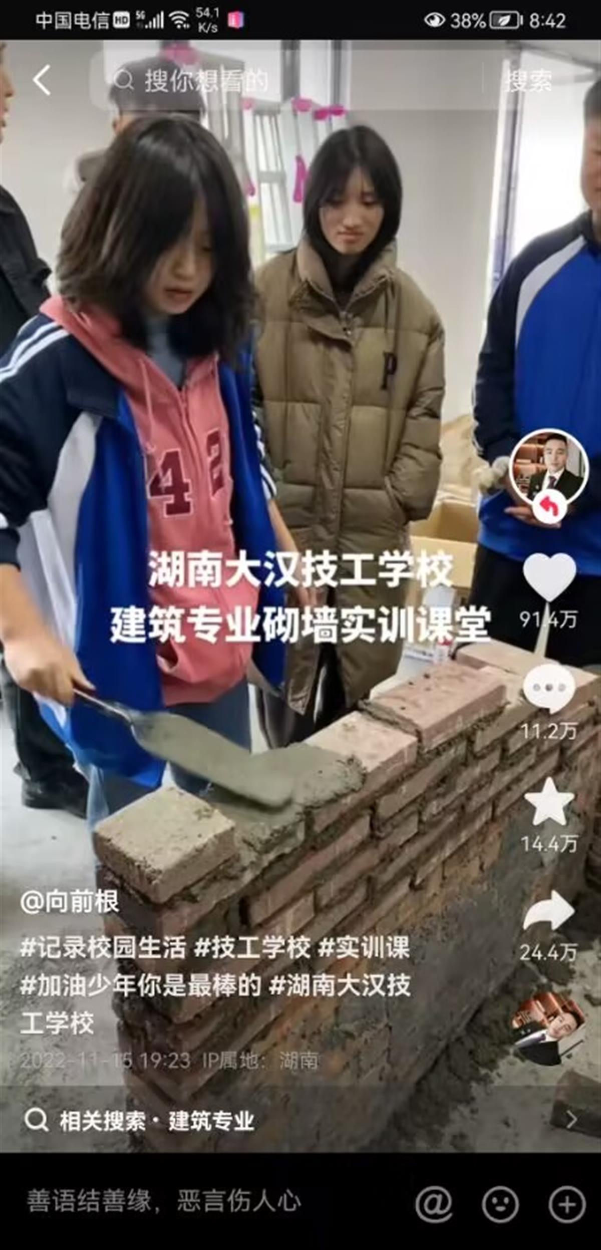近日,一条“湖南大汉技工学校建筑专业砌墙实训课堂”的短视频,在抖音个人账号发布后,引发网友热议。