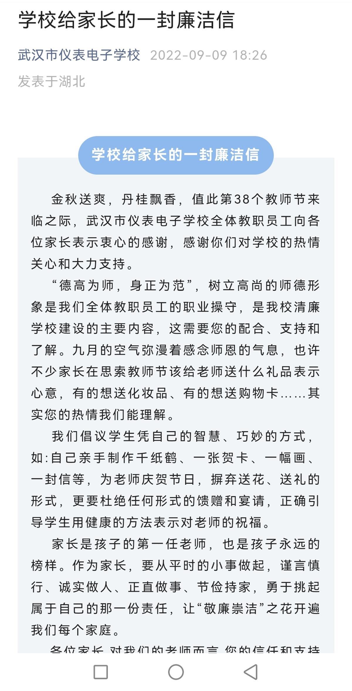 “我们坚持做好党建带团建工作,利用主题班会和板报展示等时机,充分发挥广大学生的参与积极性,拓展活动的覆盖面,同时注重家校共建,协同育人,让廉洁之风吹进校园,共守一方纯洁的教育空间。”武汉市仪表电子学校有关负责人介绍,学校召开专题会议研讨部署清廉学校建设工作,成立学校“清廉教育”建设工作领导小组,各成员职责与分工明确,制定了清廉学校建设工作方案,把“清廉学校”建设纳入学校工作议事日程之中,统一安排,统一部署,统一落实,强力推动,着力在全校树立“廉”的思想,营造“廉”的氛围。