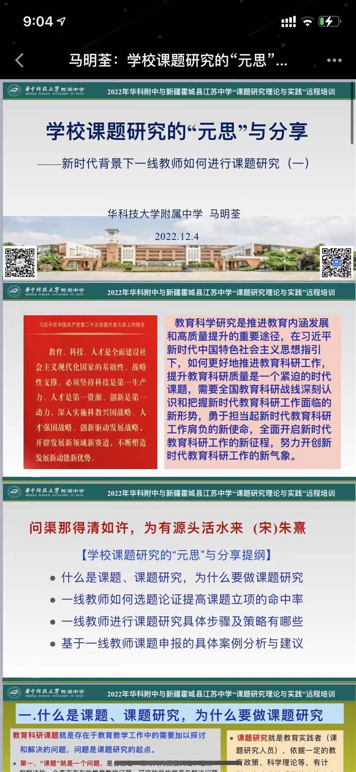 12月4日下午4时,华中科技大学附属中学(后文简称为“华科附中”)《学校课题研究的“元思”和分享》课开讲。网线这一头,是湖北省特级教师、武汉市光谷花城初级中学执行校长马明荃;那一端,是4000公里外的新疆维吾尔自治区伊犁州霍城县江苏中学的199名老师。