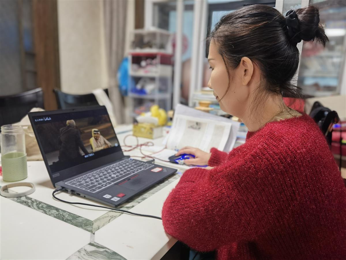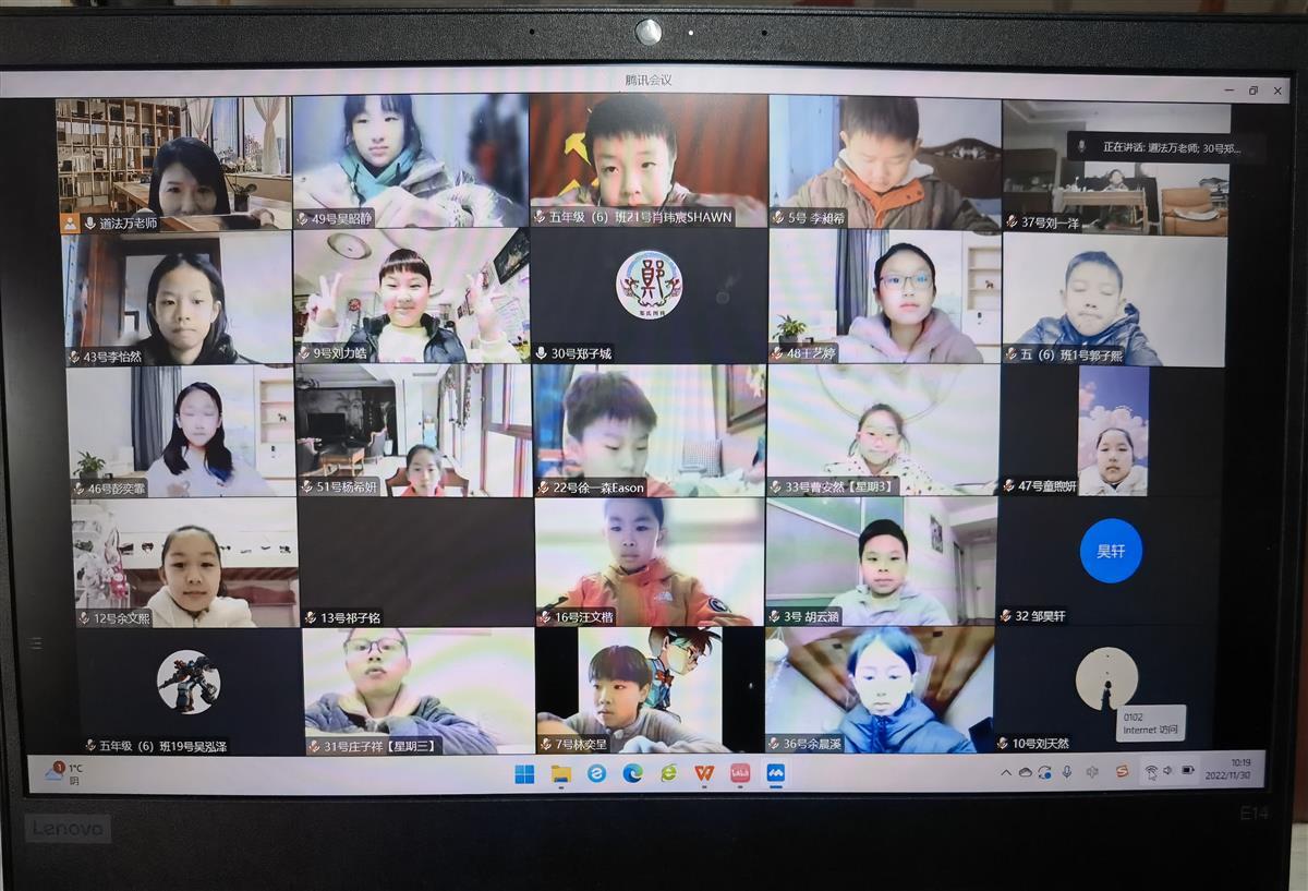 “嘟咕嘟咕哒嘎嘟咕嘟哒哒……”11月30日,三年级6班的音乐课直播间里,音乐老师冯元元戴着亮灯头饰,跟着音乐轻轻摆动身体,屏幕对面,51个孩子跟着她唱起本届世界杯球迷主题曲《Tukoh Taka》。强烈的节奏、朗朗上口的歌词、魔性又洗脑的旋律,让课堂上不时爆发出欢乐的笑声。