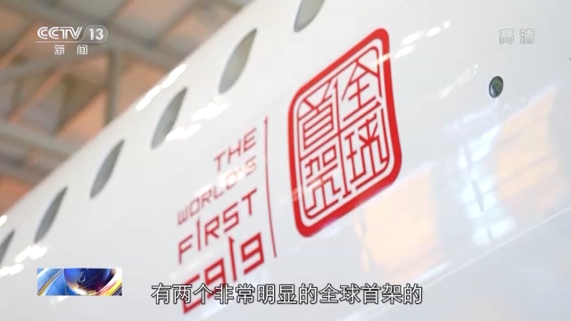 总台央视记者李宁:同时,在机头方向有两个非常明显的“全球首架”的中英文对照字样。