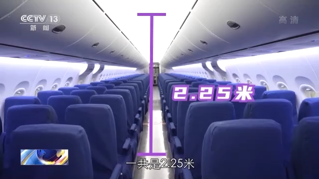 总台央视记者李宁:来到C919首架即将交付运营的客机的内部,走进客舱最直观的感觉就是它的高度,一共是2.25米,而且圆弧顶的设计也让空间感变得更强。C919的行李舱采用下拉式的设计方式,这样就保证了身材比较矮小的乘客也可以非常轻易地够到这个行李舱。