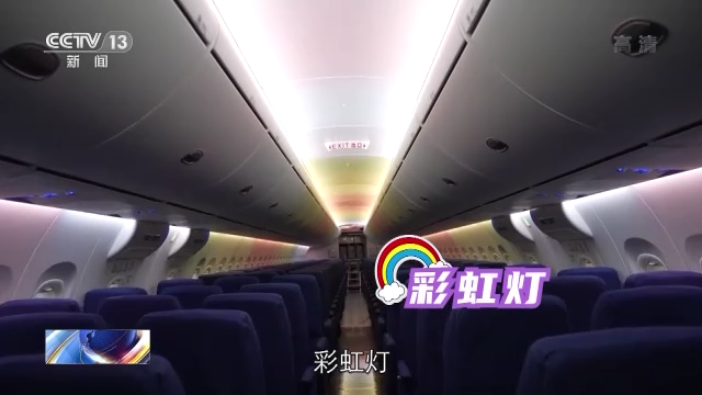 总台央视记者李宁:C919客舱内部照明是非常有特点的,它配备了LED照明和情景照明,整个客舱照明有10种情景模式,现在我们看到的就是登机时候的模式,比较明亮,方便大家来寻找座位等等。如果我们想要睡觉了,就切换到睡眠模式,可以看到舱内的亮度在缓缓地下降,换成了一种比较适合睡眠的,温馨昏暗的灯光。还有适合夜航的一种独特的灯光模式——彩虹灯。