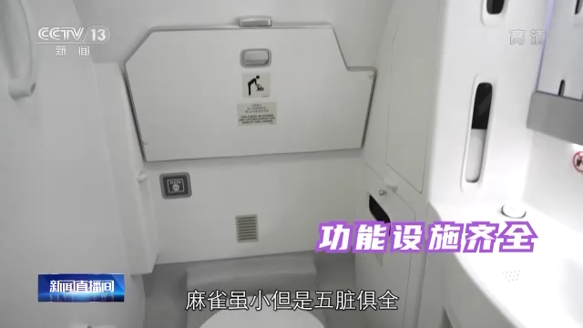 总台央视记者李宁:再来看一下C919的盥洗室,包括这种婴儿护理台板,还有这种扶手,麻雀虽小,但是五脏俱全,而且盥洗室的梳妆镜有一个独特的设计,有两条这样的灯带,这样会使你的脸色变得更加好看。