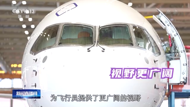 总台央视记者李宁:在C919的外形中,让人印象最深的就是它流线型的机头设计,以及4块大面积双曲面造型的风挡玻璃的设计。传统的飞机机头是正面2块,侧面4块,一共6块风挡玻璃,而C919只采用了4块,这样的设计为飞行员提供了更广阔的视野。同时,风挡玻璃采用了曲面,也让C919机头的线条更加流畅,从而减少空气阻力,可以让飞机变得更省油。