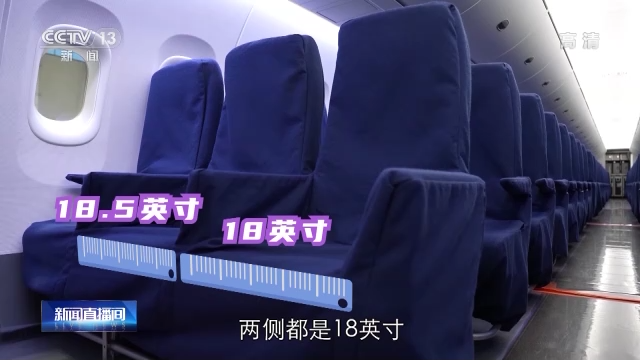 总台央视记者李宁:在C919客机上到处都体现这种人性化的设计,我现在所坐的座椅是位于中间的座椅,平时大家在坐飞机的时候可能不太会选择这样一个地方,在C919上,它中间座椅是18.5英寸,两侧都是18英寸,多出来的0.5英寸就是一种人性化的设计。此外,我们看行间距,像我这样一米八几的身高,这种间距也是可以满足的。除此之外还有靠枕,这个靠枕是可以上下拉动的,也是可以满足大家身高不同的需求。