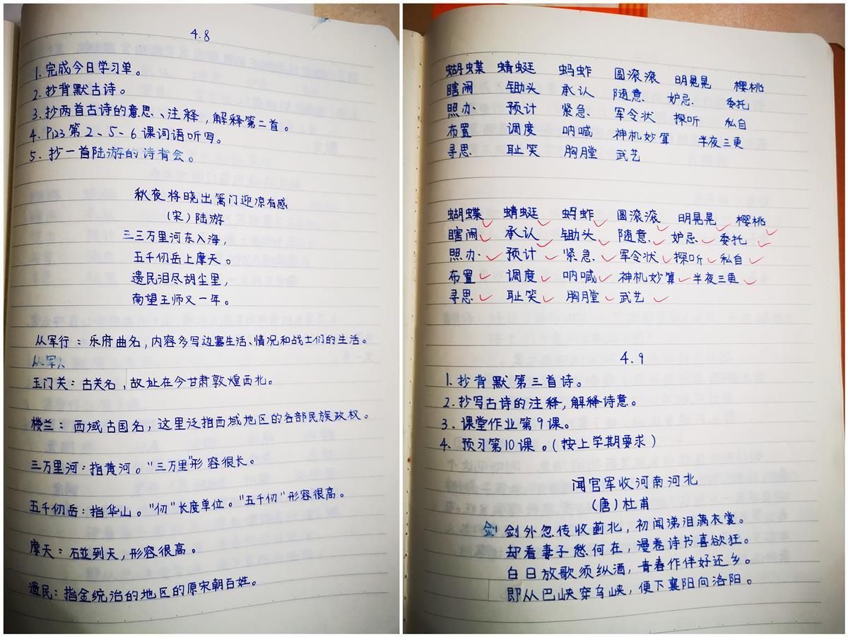 汤女士十分细心地保留了儿子小学六年级的语文课本,记者看到,每一篇课文都做了很多批注,有好词、好句,还有近义词、反义词、关联词、多音字、句子的修饰手法等。课本上的空白地带被写得满满当当,但是井井有条。