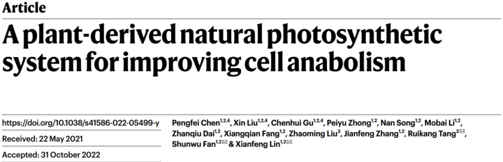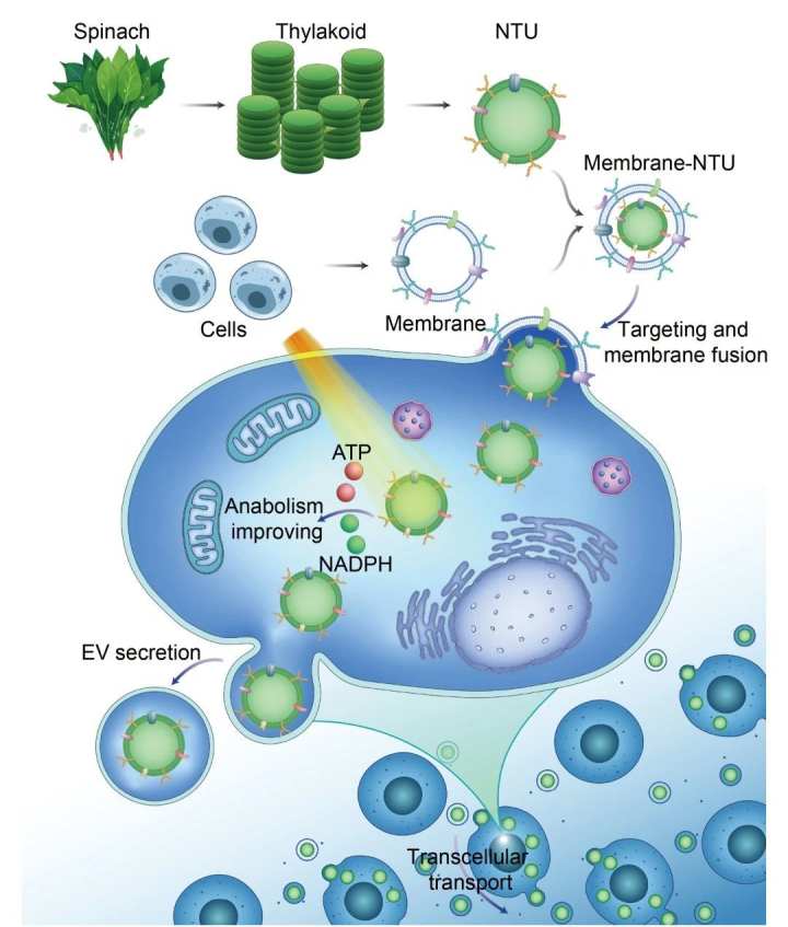 浙江大学医学院附属邵逸夫医院骨科林贤丰医师、范顺武教授团队与浙江大学化学系唐睿康教授团队成功从菠菜中提取了具有光合作用的“生物电池”——类囊体,并通过精密的制备技术,在国际上首次实现植物的类囊体跨物种递送到动物体衰老病变的细胞内,让动物细胞也拥有植物光合作用的能量,以此敲开逆转细胞退变衰老的“时光之门”。