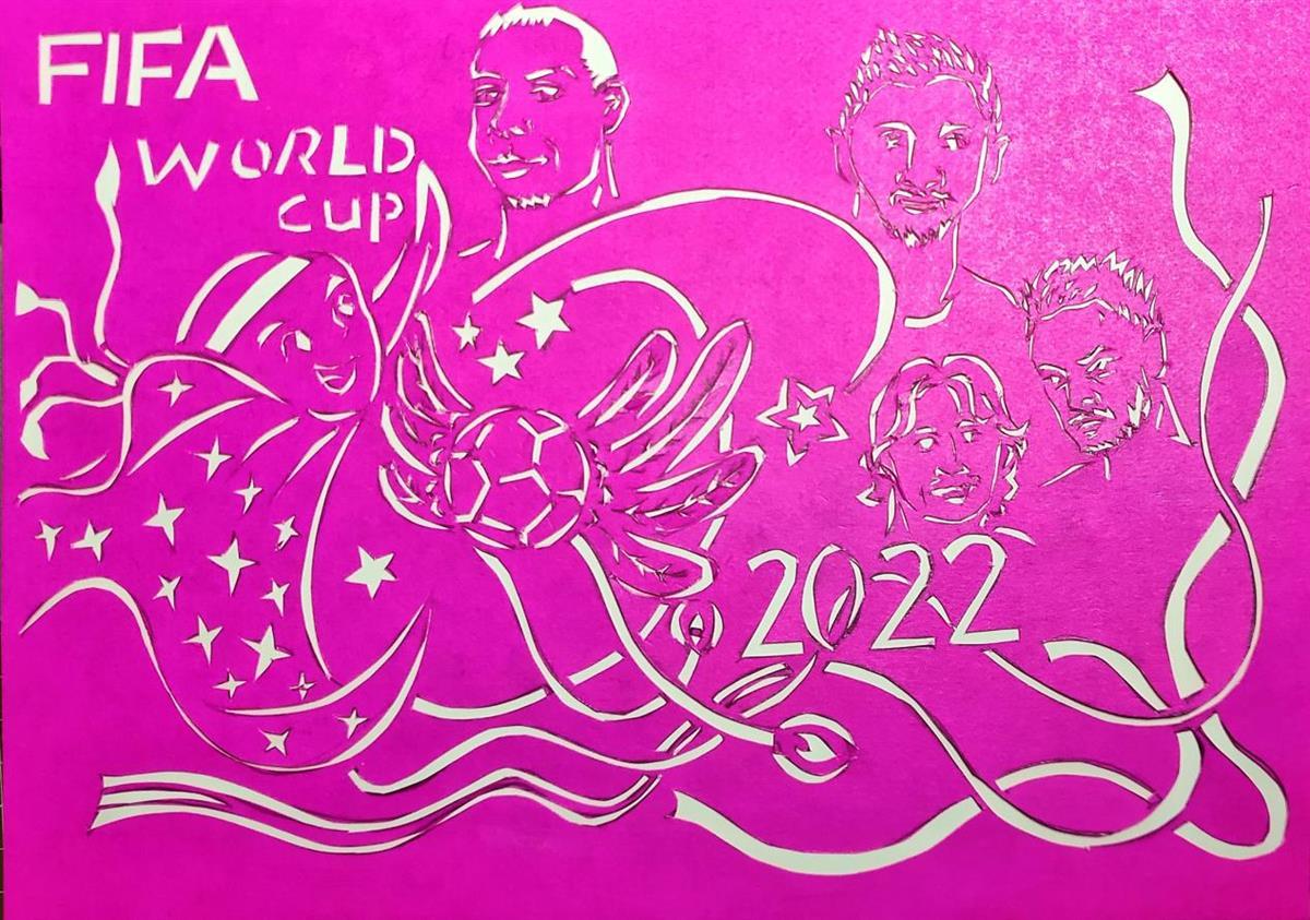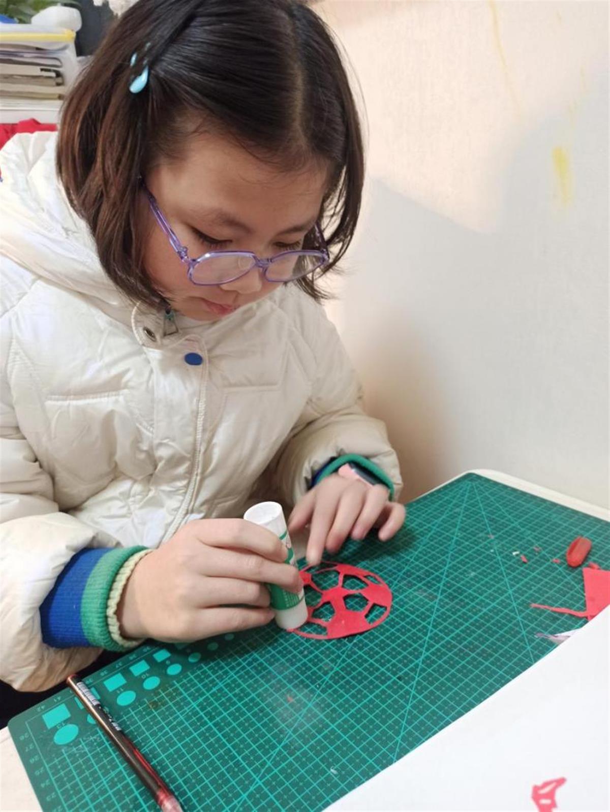 拿起剪刀,在彩纸上剪下各种图案,再将作品贴在纸上……制作过程中,该校同学根据自己的兴趣了解世界杯的历史、球队球星,观察踢球动作,学会使用工具。“我剪的是一个球星的形象,他奔跑在绿茵场上,追逐着前面的足球。”该校学生邱雅涵说,把剪纸和世界杯融合太有意思了,感觉传统艺术也变时尚了。